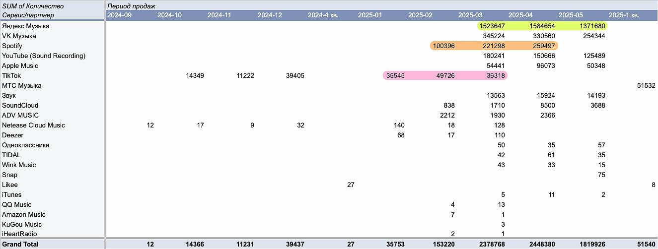 - Разные платформы. Spotify, Apple Music, VK, YouTube и другие стриминги обозначены отдельными строками.