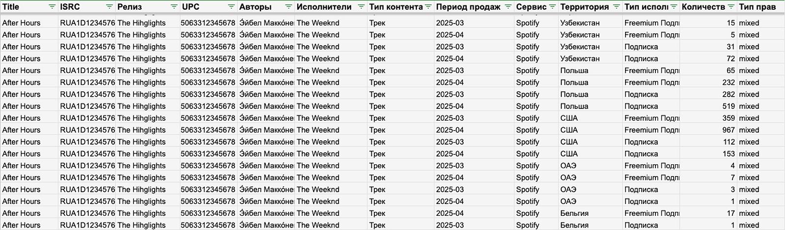 - Разные территории. Обычно все площадки присылают отчёты по странам: один и тот же трек может появиться десятки раз.