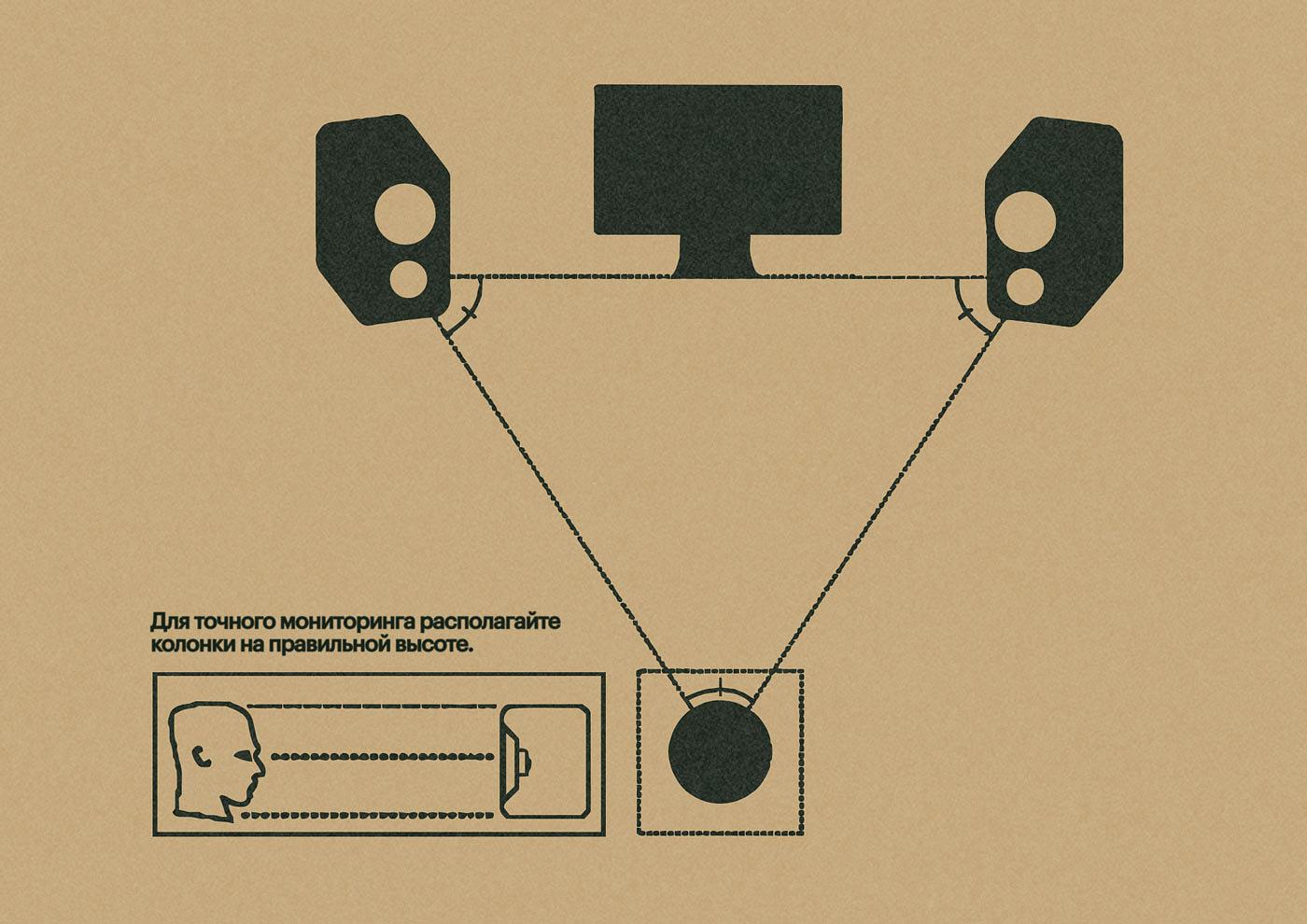 Студийные мониторы и ваша позиция прослушивания должны образовывать между собой равнобедренный треугольник, чтобы звук из обоих мониторов доходил до вас одновременно. Если позиционирование выстроено оптимально, в точке прослушивания вы услышите стерео-поле, звуки будут правильно распределяться в пространстве, будет ощущаться глубина звучания.