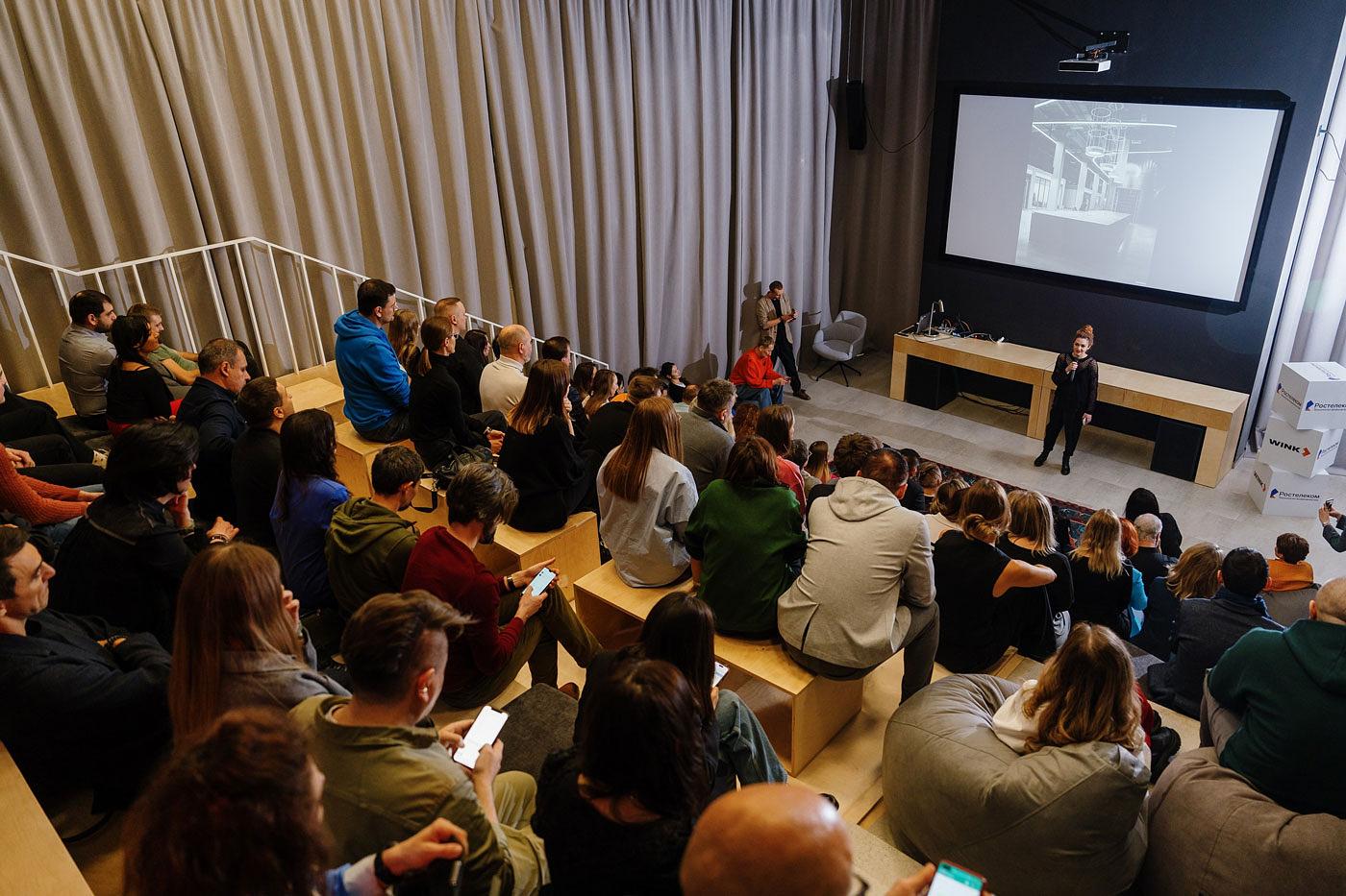Современный коворкинг с площадкой-амфитеатром. Пространство оснащено качественной акустикой и театральным светом.