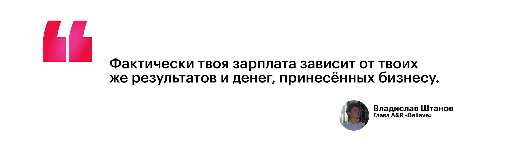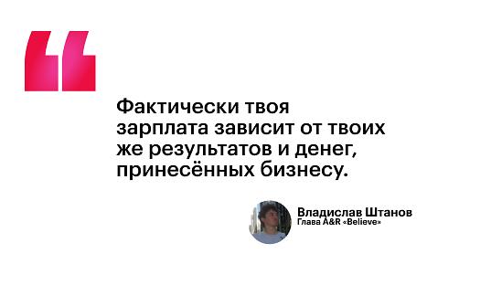 Штанов: Всё зависит от внутренних договоренностей. Рынок у нас молодой, нет чёткой вилки, сколько должен зарабатывать A&R. То есть и базу как таковую не обозначить, и потолок тоже, поскольку бизнес очень разных размеров — от инди-лейбла с маленькими оборотами до крупной компании.