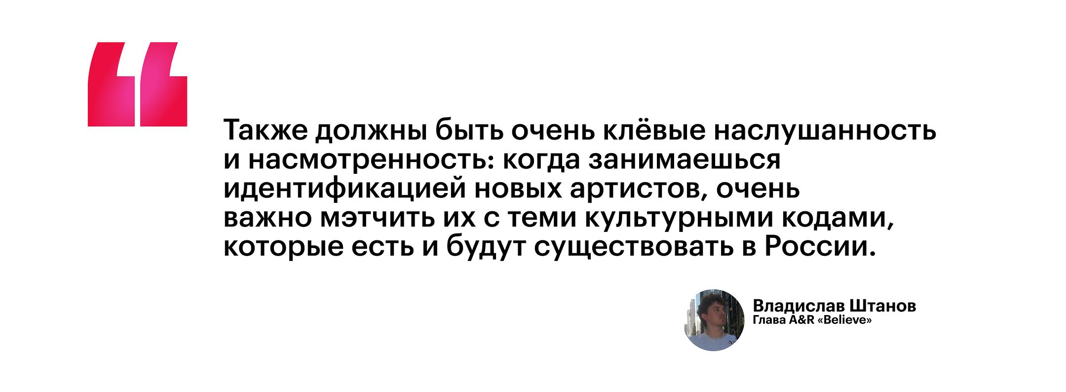 Штанов: Понимать всё на рынке, на котором работаешь — от юридических основ до умения работать с дата-аналитикой. Нужно быть в курсе музыкальных трендов, иметь представление о том, что будет актуально завтра, послезавтра и через много лет. Формируется это сочетанием насмотренности и понимания уже произошедшего на разных рынках: жанровых трендов, взлетевших артистов, маркетинг-кейсов вместе с тестированием гипотез на потенциал новых артистов и набирающих обороты жанров.
