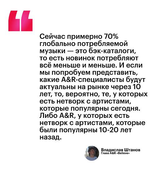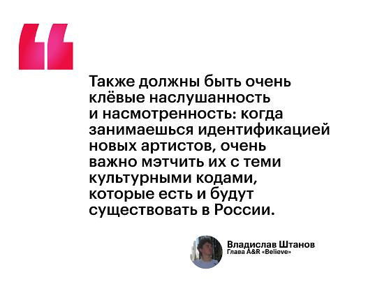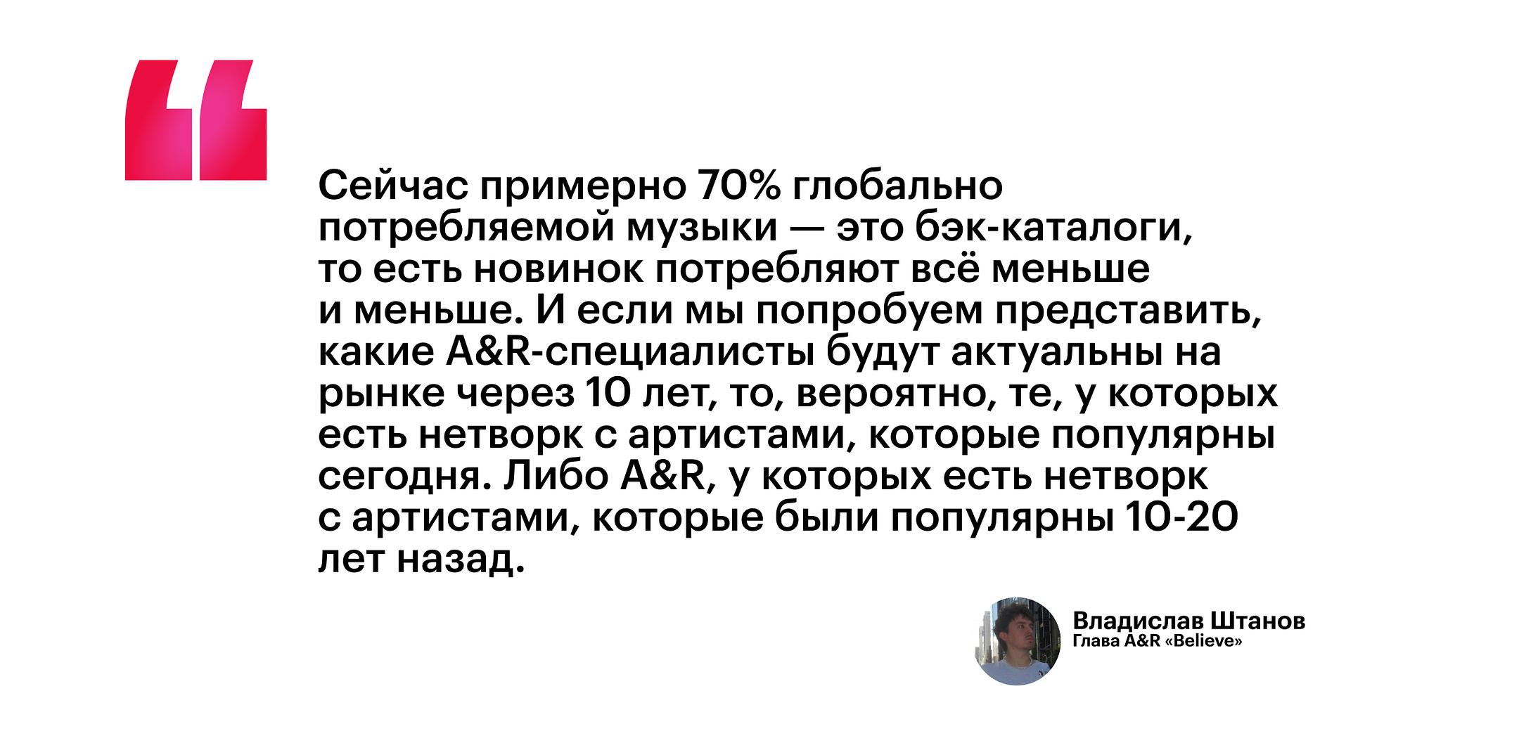Штанов: Это зависит от зрелости рынка. Сейчас, возможно, возраст A&R действительно важен, потому что многие игроки рынка нацелены на подписание фрешменов, взлетающих артистов из TikTok. Но Believe смотрят на 10 лет вперёд.