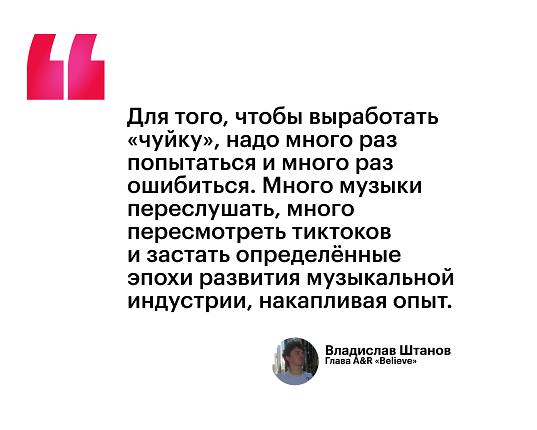 Штанов: TikTok — это инструмент, как и многие площадки. Здесь важно не только находить артиста, но и видеть потенциал его развития. Нужно не просто тупо подписывать артиста, когда он сразу стрельнул. Если у какого-то лейбла такая стратегия, то окей, но если мы говорим про Believe, то мы работаем вдолгую. Нам интересно подписать артиста и потом за счёт ресурсов команды, сервисов прийти в другую точку развития, например, развить артиста от уровня C до уровня A.