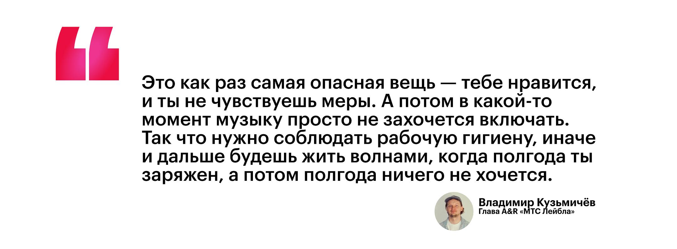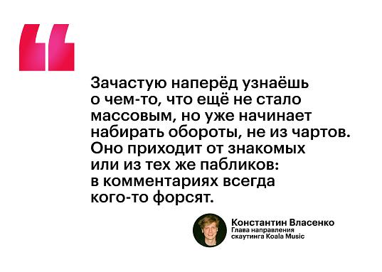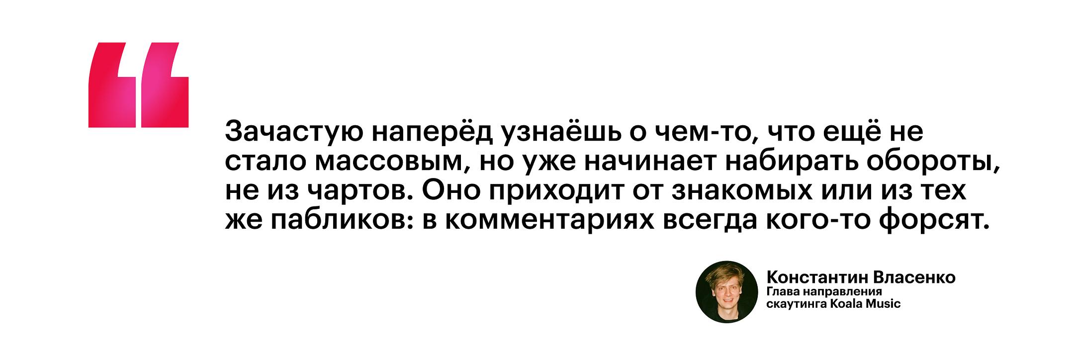 Власенко: Это важная часть работы. Зачастую тренд могут просто скинуть друзья. Важно находиться в комьюнити, держать руку на пульсе. Иногда за трендом выстраивается очередь из лейблов. Мы понимаем, что нам просто важно до принятия финального решения войти в эту очередь. В таком случае у нас есть большой шанс подписать этот трек, предоставить артисту высокий уровень сервиса.