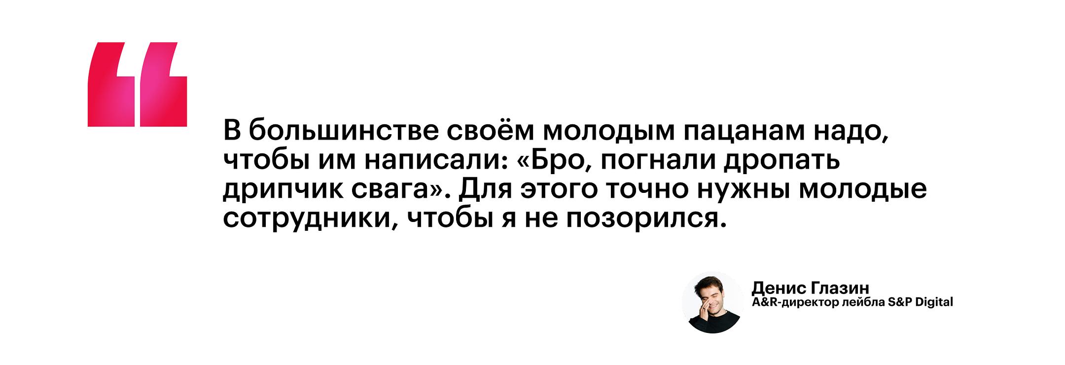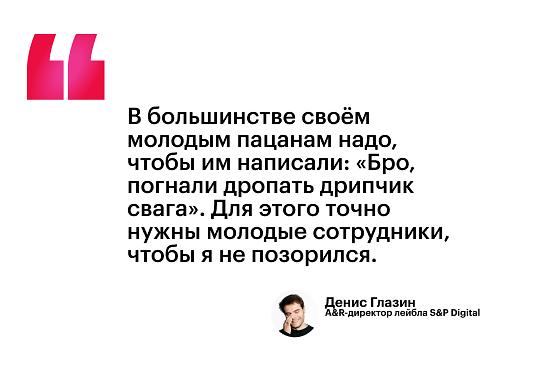 Глазин: В S&P Digital есть стажировки, но на данный момент все вакансии закрыты. Скоро будет проходить «Академия Музыкальной Индустрии», там будет примерно 30 учеников в этом году, из которых 20 пойдут на A&R и 10 — на маркетинг. Мы явно возьмём кого-то из них.