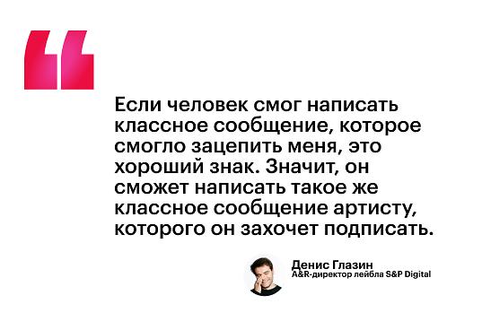 Глазин: Утро для пожаров: это ответы на срочные вопросы сотрудников по сделкам и авансам, решение возникших проблем. Далее я приезжаю в офис, и начинается процесс согласования или продумывания сделок вместе с командой скаутов и A&R-менеджеров. Они предварительно общаются с артистами, находят тех, кому интересно сотрудничество. Я придумываю, что мы им можем предложить, обсуждаю с командой варианты, и дальше мы уходим с ними к артистам.