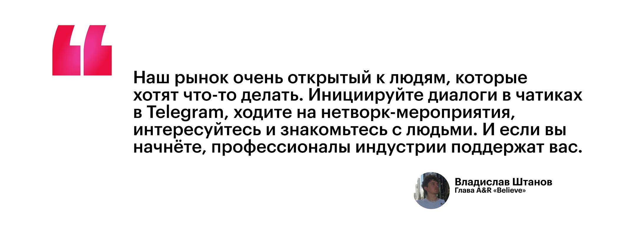 Власенко: Сейчас есть музыкальные сервисы и много перспективных лейблов, в которых можно узнать про программы стажировок или походить на их мероприятия. Перед выбором места работы предварительно стоит изучить по чартам, какие лейблы выпускали те или иные успешные треки, посмотреть имиджевые кейсы. Эта информация есть в открытых источниках. Индустрия достаточно живая, и если очень хочешь работать в ней, то ты 100% сможешь это сделать. Порог входа не такой высокий, как может казаться. Даже если начнешь работать в не суперклассном, но уже связанном с индустрией месте, то, проявив себя профессионально, быстро окажешься в хорошей компании и нащупаешь своё направление.