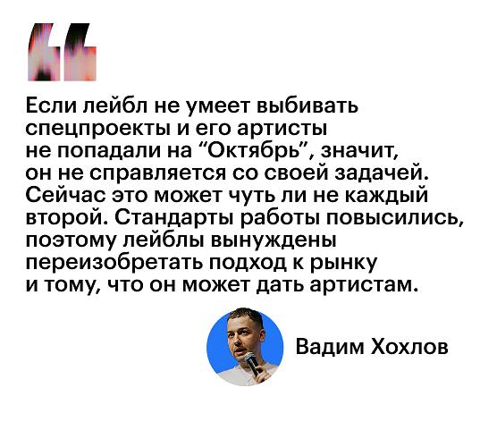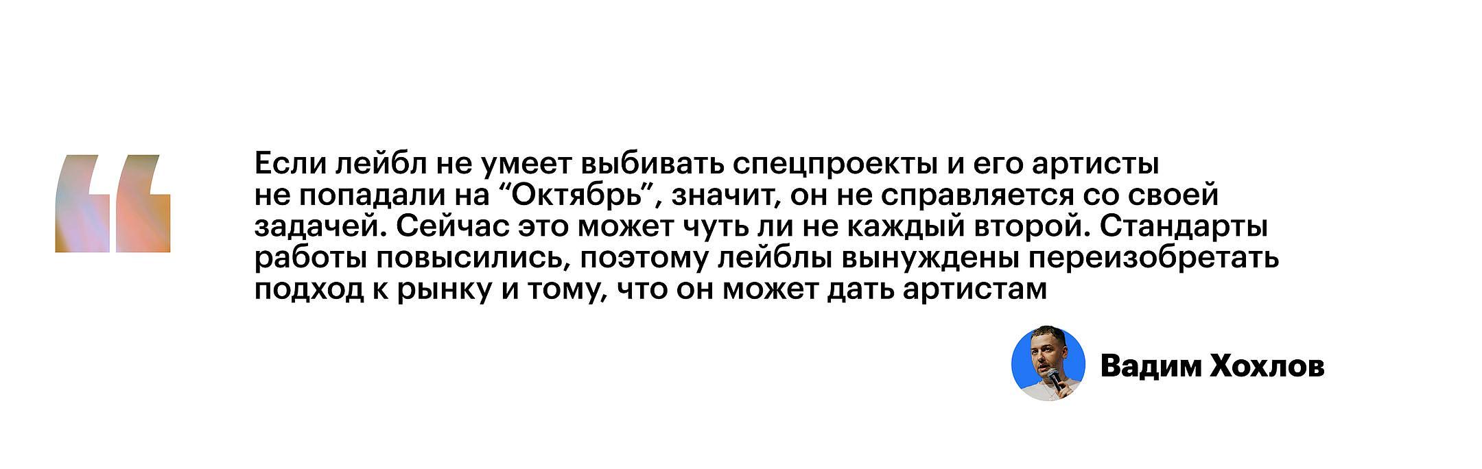 Опыт последних лет показал, что деньги уже вообще не решают: треки вирусятся органически, рекламный рынок страшно перегрет. К нам приходит всё больше артистов благодаря сарафанному радио — и они идут не за деньгами и красивыми обещаниями, а за вовлечённой командой, с которой сложится по-человечески комфортная и эффективная коммуникация».