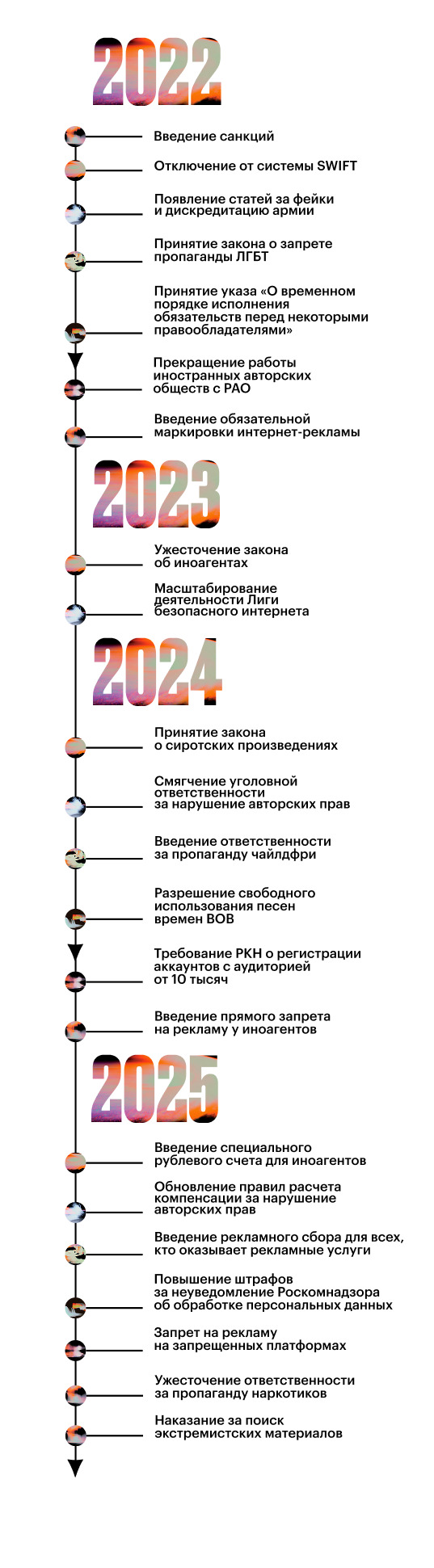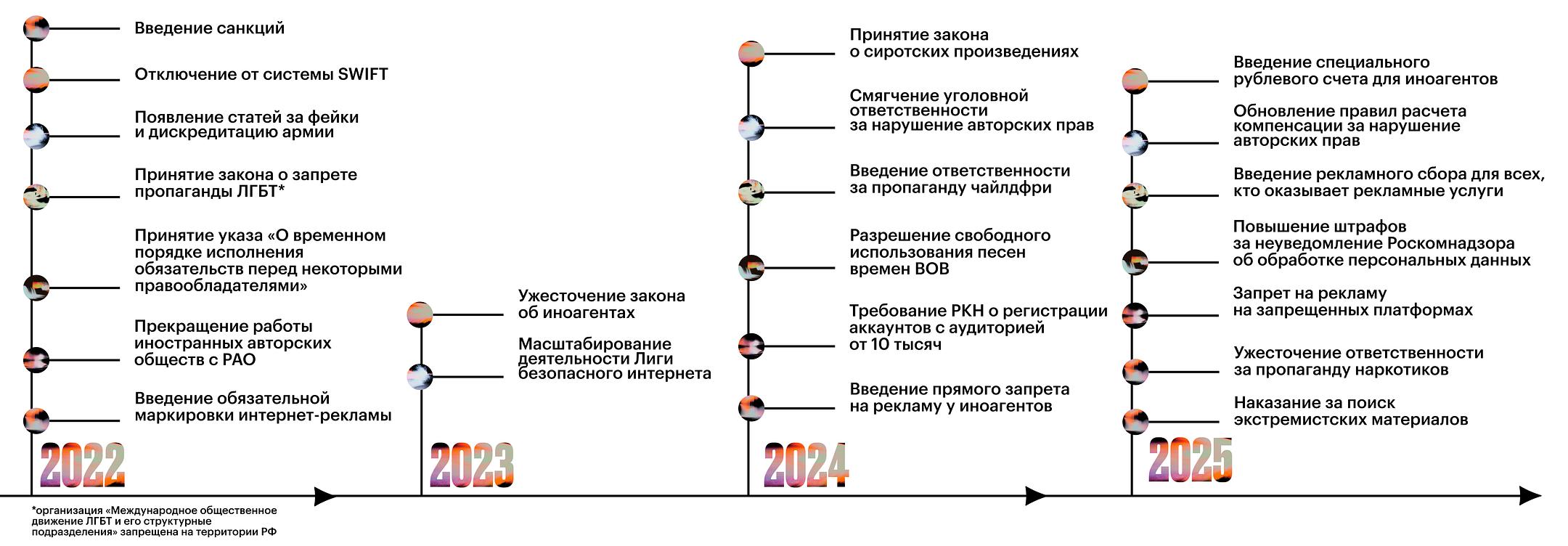 С 2022 года контекст, в котором существует российская музыкальная сцена, изменился — в том числе и на уровне законодательства. «Политика и законы начали влиять на развитие индустрии так же сильно, как новые жанры или тренды из TikTok: хочешь ты того или нет, но это реальность», — говорит юрист по интеллектуальной собственности Вадим Хохлов. Ниже — ключевые законы и инициативы, которые заметно повлияли на музыкальный рынок за последние три года.