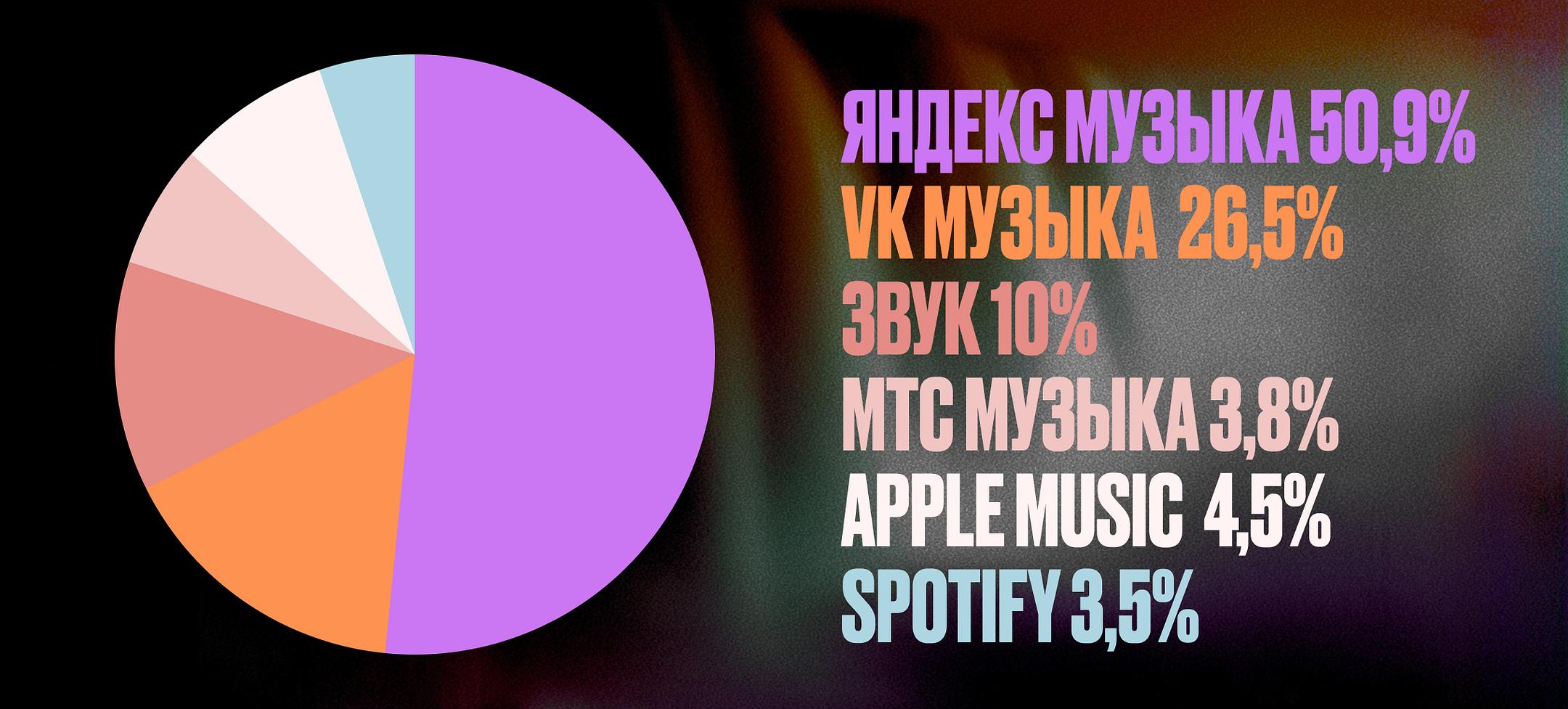 По данным J’son & Partners Consulting, лидером рынка по доходам является Яндекс Музыка. Так, по итогам 2024 года компания нарастила долю на 14,2 процентных пункта, Звук — на 5,9 п.п. Доля VK Музыки сократилась на 6,5 п.п., Apple Music — на 4,5 п.п., и Spotify — на 4,7 п.п.
